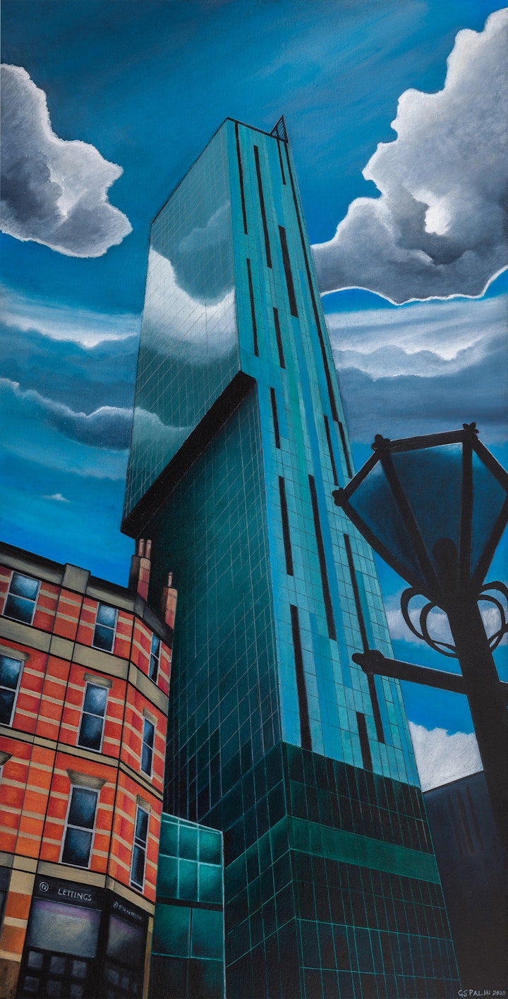 This painting shows that the lamppost is pointing to the Beetham Tower to dance with the old Victorian building. The tower is powerful.